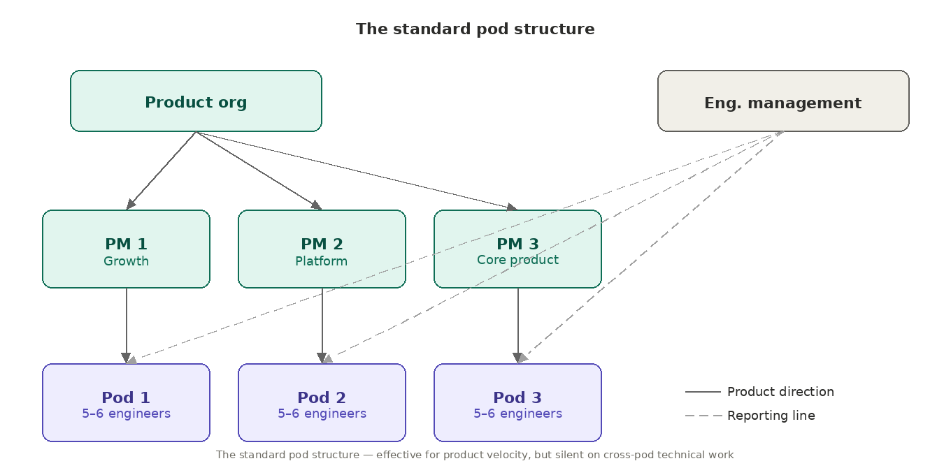The standard pod structure — effective for product velocity, but silent on cross-pod technical work