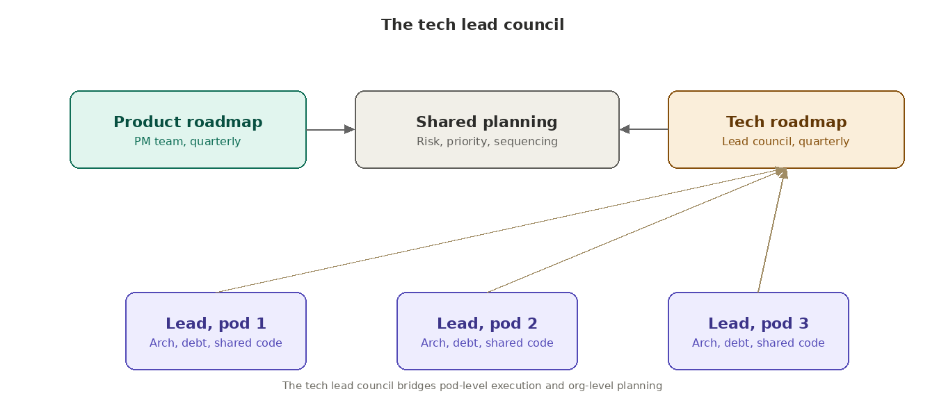 Product roadmapPM team, quarterlyTech roadmapLead council, quarterlyShared planningRisk, priority, sequencingLead, pod 1Arch, debt, shared codeLead, pod 2Arch, debt, shared codeLead, pod 3Arch, debt, shared code